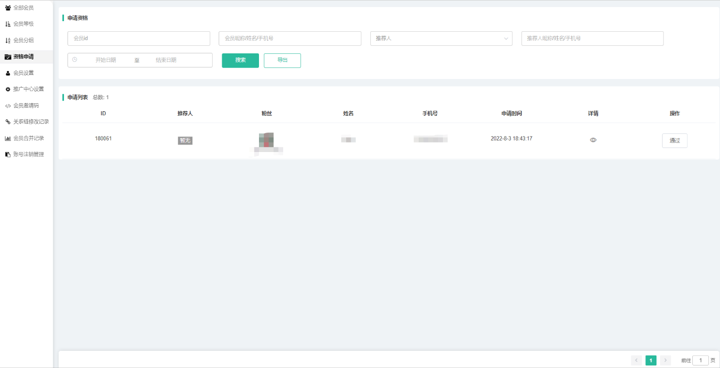 搜索条件有:ID/昵称/姓名/手机、推荐人(推荐人的姓名/手机/昵称)、总店、申请时间