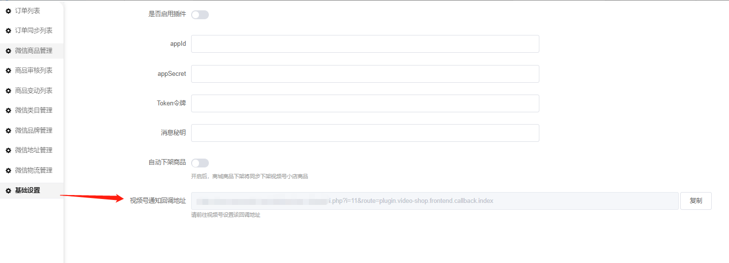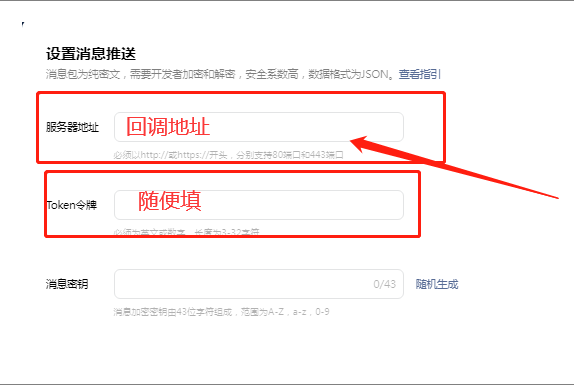 消息推送填写内容可以到后台插件复制回调地址填写到服务器地址处(Token令牌自行设置后填写到后台)