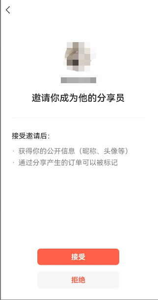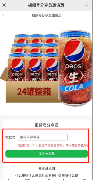 2)邀请页面链接:复制链接到邀请页面,输入微信号(微信-我的-个人昵称下单的微信号,不一定是手机号),再点击加入分享员后显示二维码,识别二维码进行邀请,确认后则会提示已接收邀请.