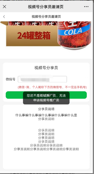 邀请限制-推广员:开启推广员,是推广员身份才可以申请为视频号分享员,如未勾选的等级进行申请则会提示未满足需求.