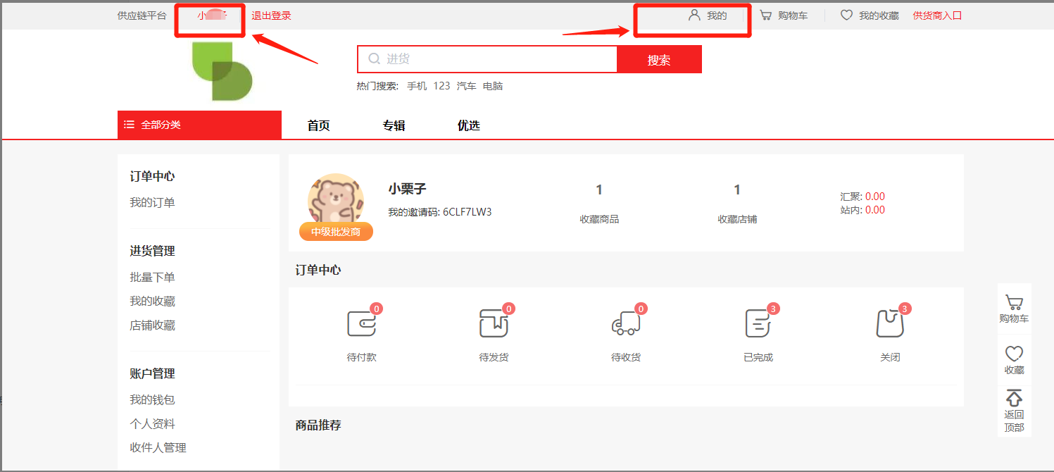 2)在这里可以看到收藏商品,收藏店铺的数量,以及余额和一些订单信息。