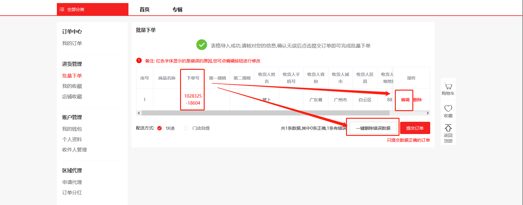 3)批量下单的表格上传后会执行批量下单,如果有错误的信息,会有提示,可以重新编辑,或者一键删除错误信息