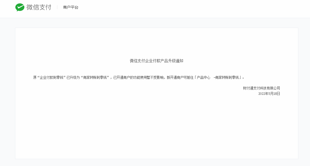 微信官方通知,原“企业付款到零钱”已升级为“商家转账到零钱”,已开通商户的功能使用暂不受影响,新开通商户可前往「产品中心 -商家转账到零钱」,开通商家转账到零钱。