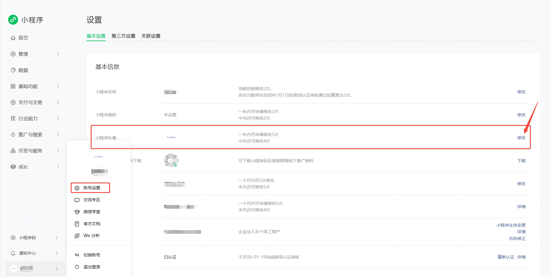 1、打开该网址:https://mp.weixin.qq.com/,先登录服务号--设置(请根据下图操作),操作完了服务号在操作小程序一样的操作,小程序是修改小程序头像,多一步管理员扫码(这里省略)
