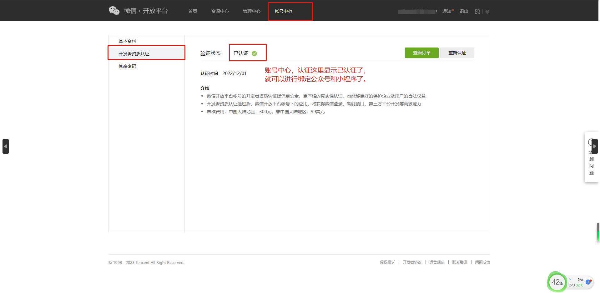 第八步:在账号中心查看开发者资质认证,验证状态显示为已认证。
