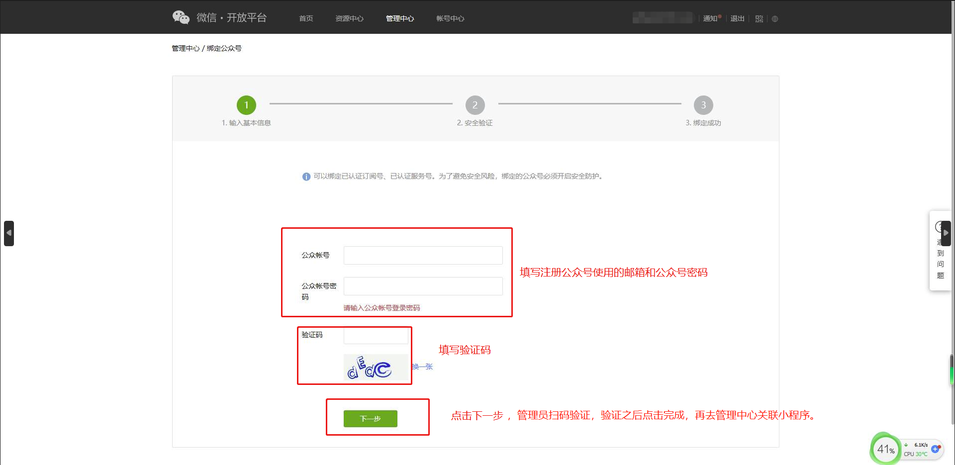 第九步:认证通过之后,点击管理中心,分别选择公众号和小程序,来绑定账号。