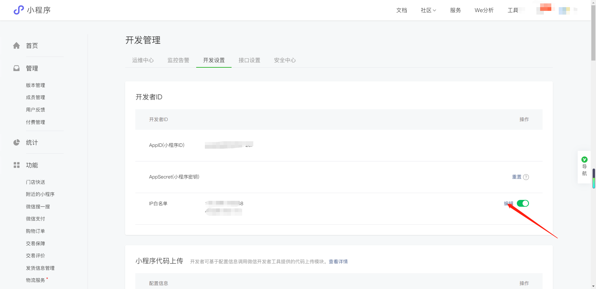 2:点击开发管理-开发设置-设置密钥,并且复制好信息,点击添加IP白名单。