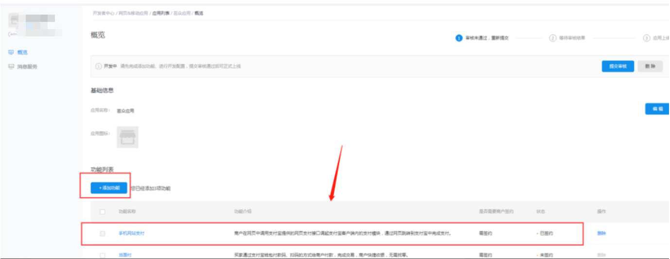 三、点击支付接入,创建新应用,功能勾选‘手机网站支付’,注意:手机网站支付必须是已开通下来。