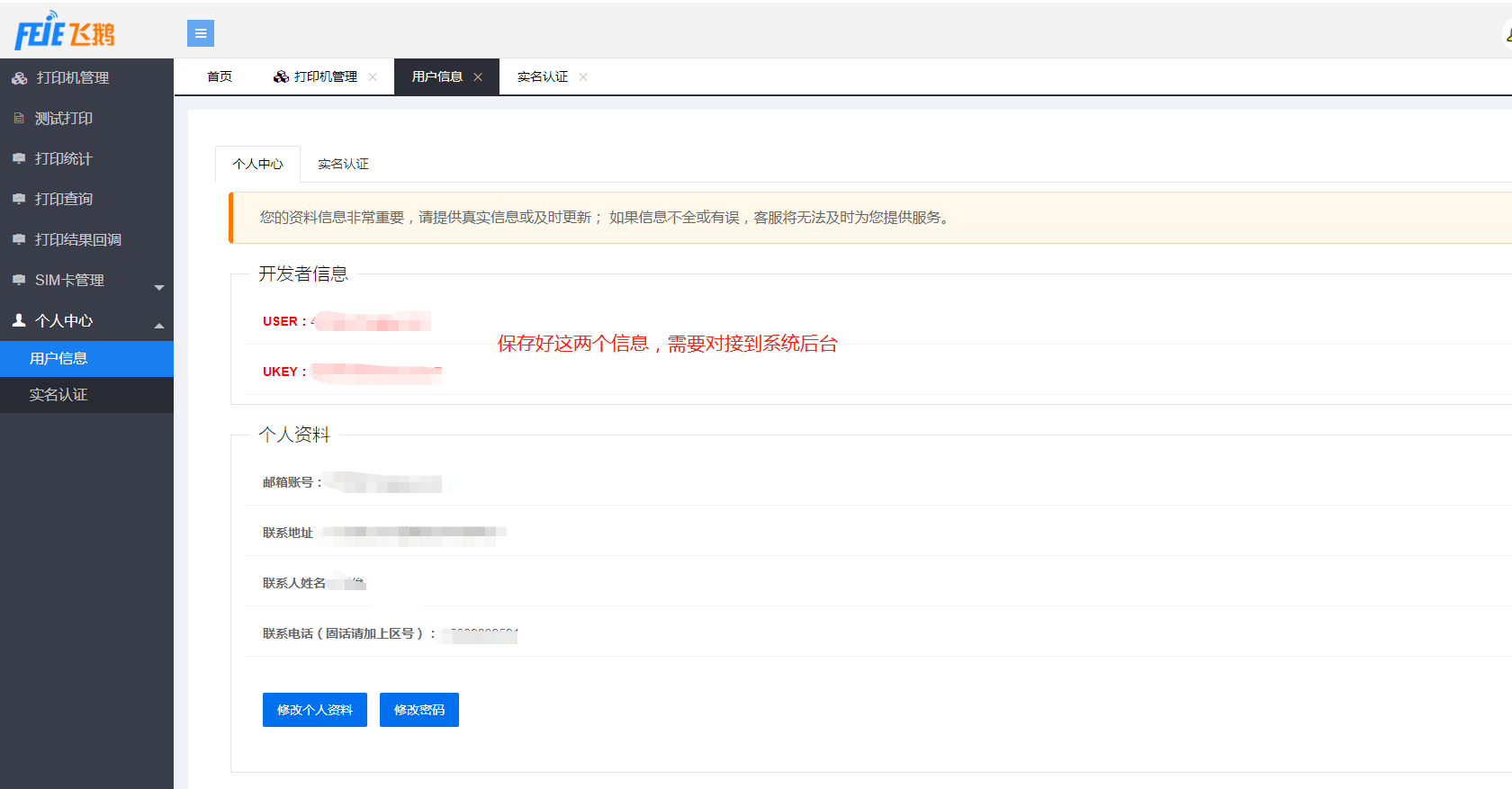 ②登录飞鹅平台,使用账号密码登录(购买飞鹅后会收到,或者可联系客服),在个人中心  -- 开发者信息  --查看USER、UKEY,并复制粘贴到后台打印机设置处。