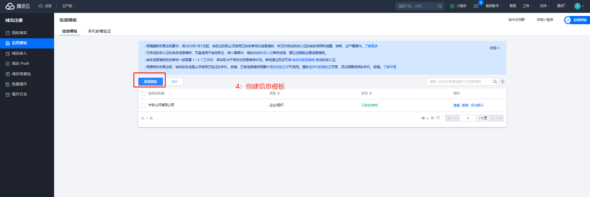 第四步:购买以后,进入控制台找到域名,创建信息模板,认证信息,等待审核