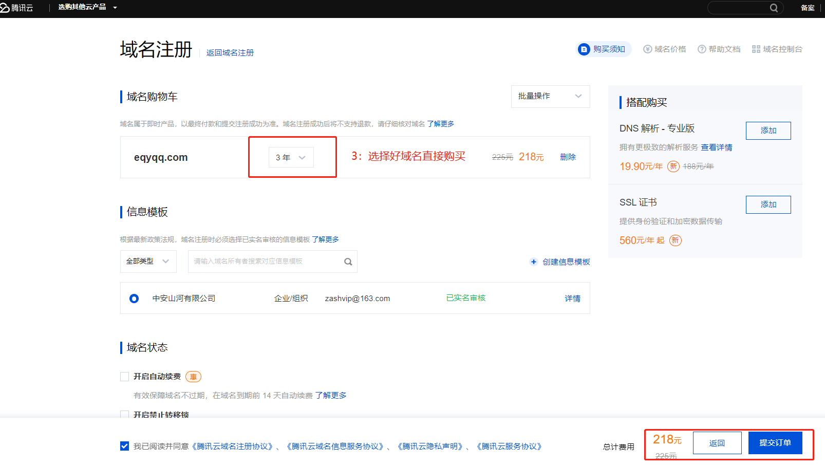 第三步:选好域名直接购买,一般推荐直接购买3年自动续费