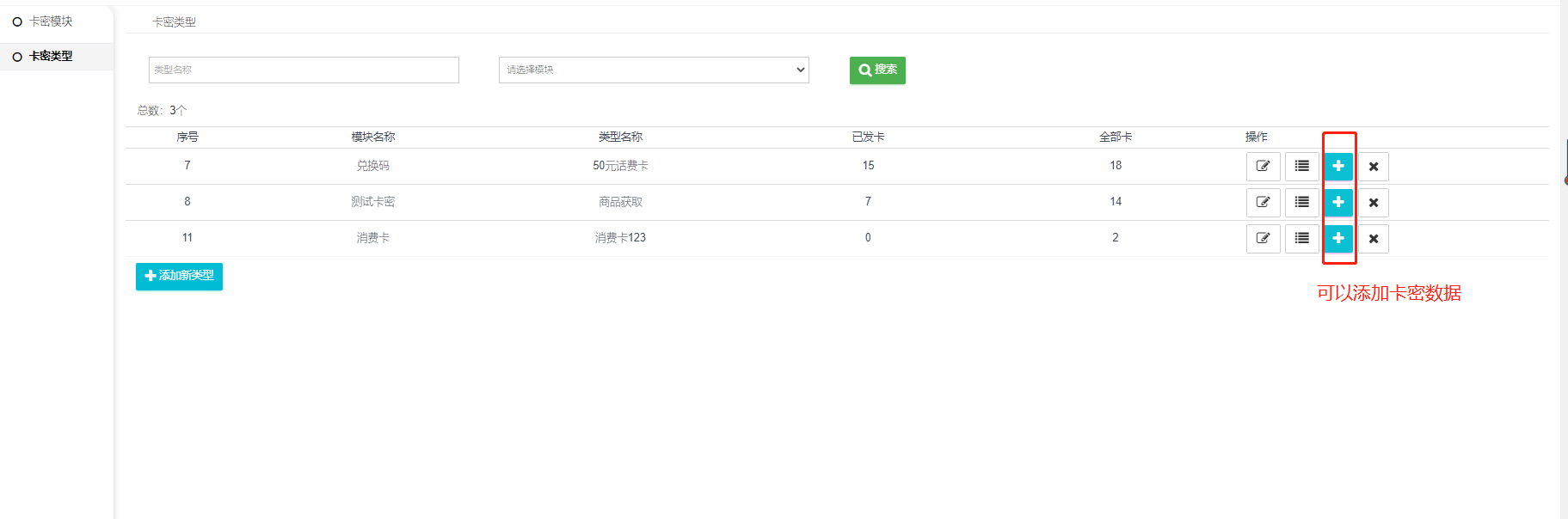 赠送卡密方式:1. 赠送某个模块下的卡密 2. 赠送某个类型的卡密