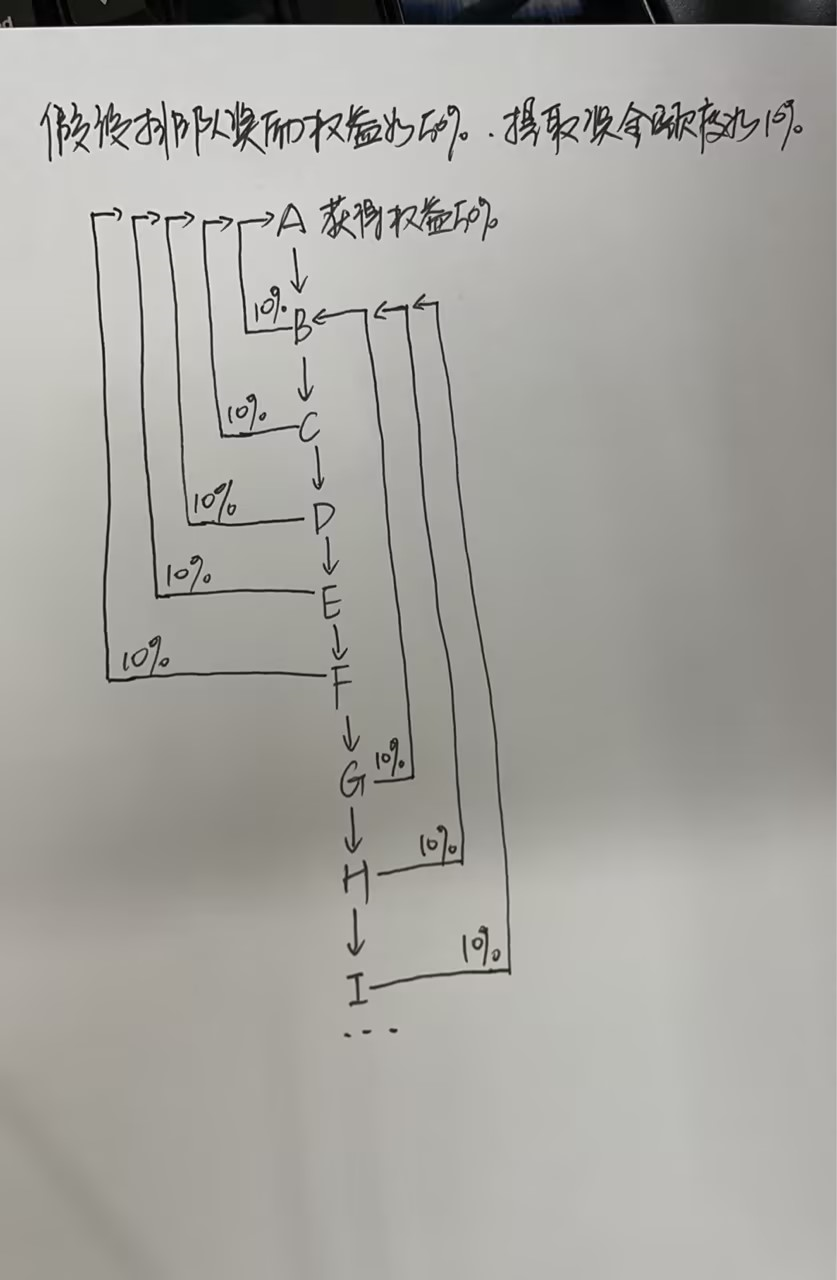 B下单,B获得待返奖励50元(需排队等A返完后再轮到B)。提取100*10%=10元,返给A10元,此时A剩余待返奖励为40元。