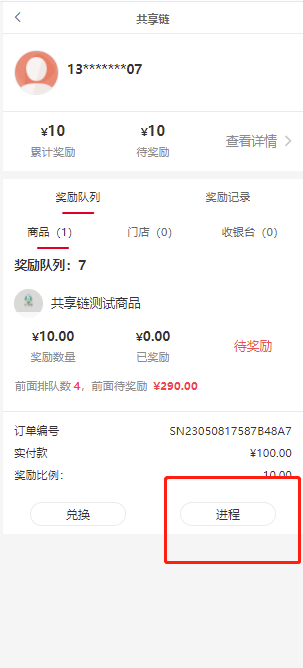 会员前端共享链界面,可点击抽奖功能抽取其他待返奖励比列。