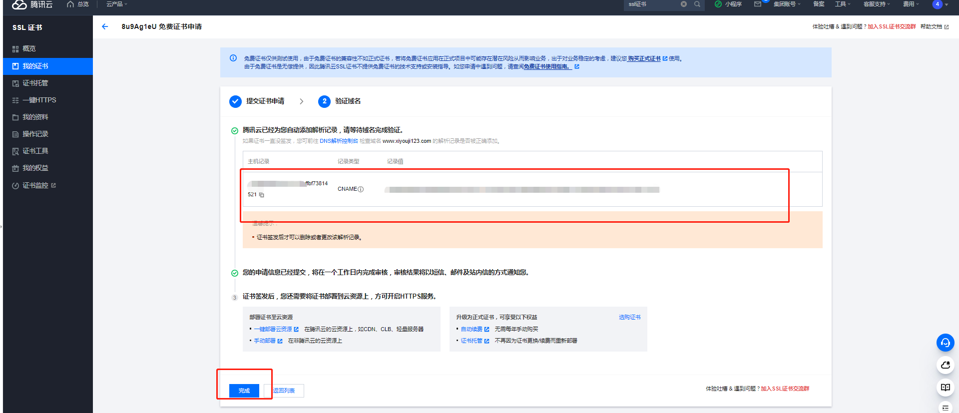 点击完成之后需要等待几分钟,等证书签发完成,签发完成的证书进行下载