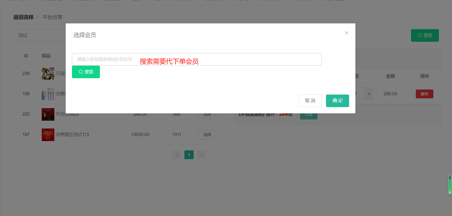 选择好商品后,点击结算,搜索要下单的会员,点击确定预下单。