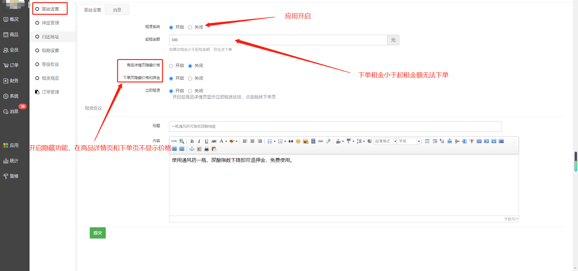 开启/关闭租赁:开启后商品才会具备租赁设置,前端购物车增加租赁购物车功能。