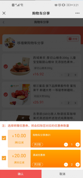 转赠优惠券:开启后,用户在分享购物车可以选择自己的优惠券(会员自己领取的所有平台优惠券)、张数、进行转赠优惠券