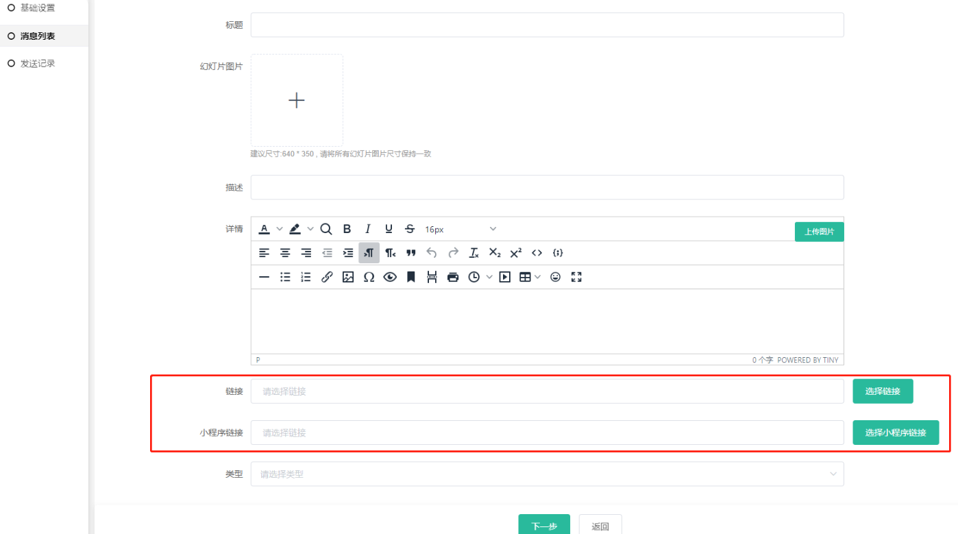 同时可选择消息点击跳转的链接,如果不设置链接,则默认为打开消息详情,设置链接则跳转到指定的链接。