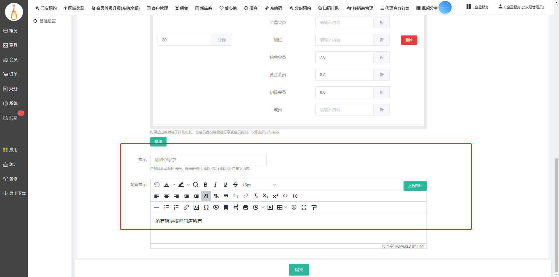 1)前端会员扫码成功排队后弹出的提示,提示语格式:排队成功,号码为xxx+设置的内容