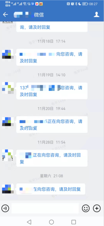 企业微信会话列表应用提示新客服消息:进入后显示咨询提醒,点击即可跳转到客服手机端