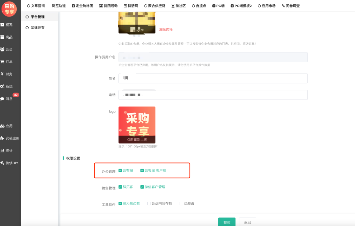 如果企业默认权限没有设置在线客服应用权限,可在企业管理独立设置中进行权限设置