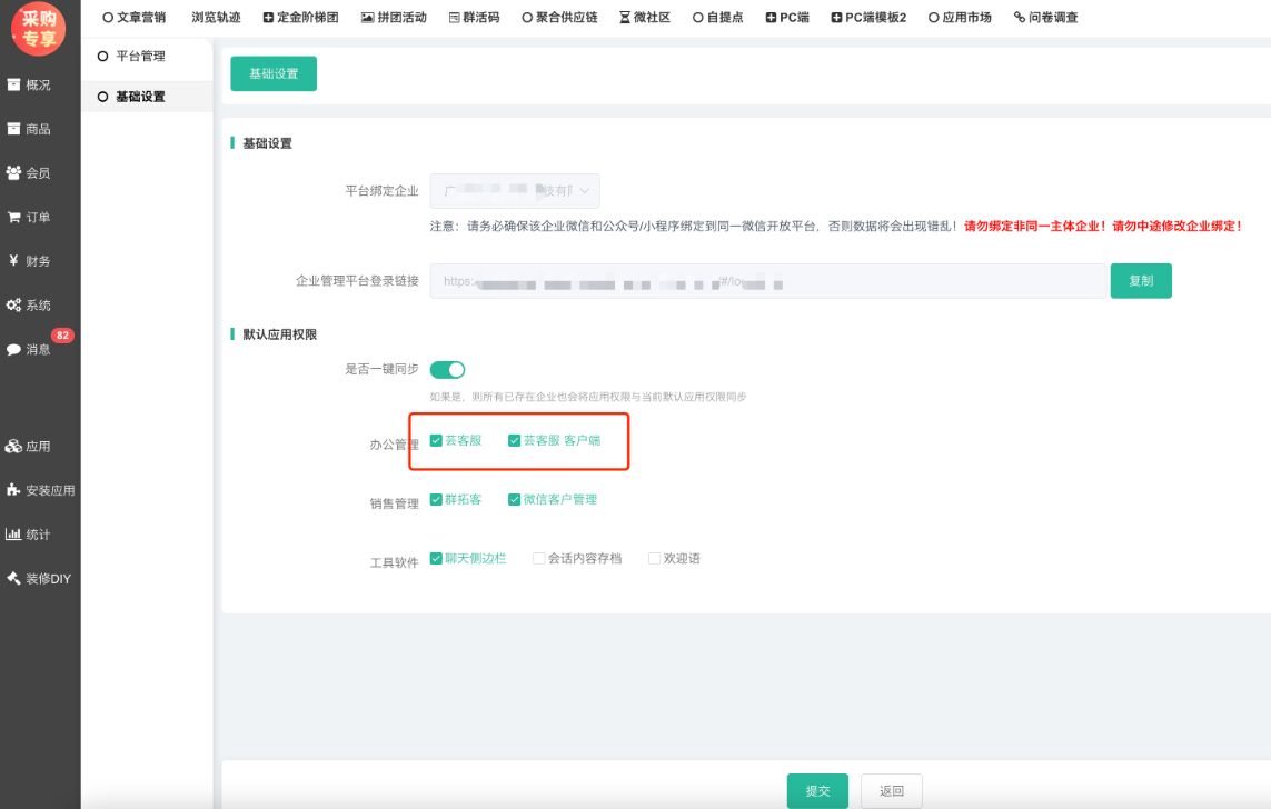 在企业平台管理--基础设置--默认应用权限中勾选在线客服、在线客服客户端,则创建企业时,企业默认具备在线客服使用权限。