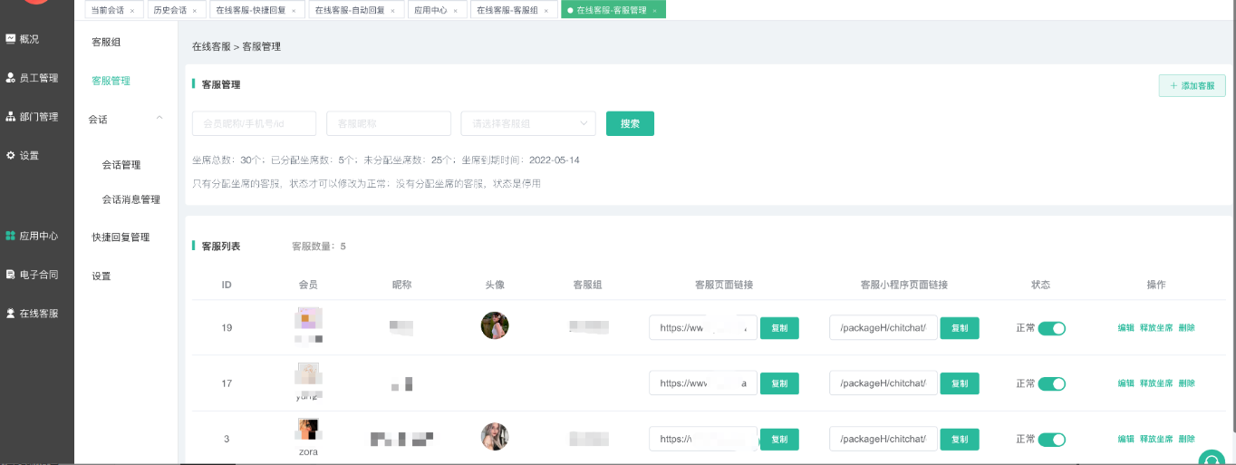 企业管理PC端--在线客服--客服管理,获取对应的客服的链接、路径: