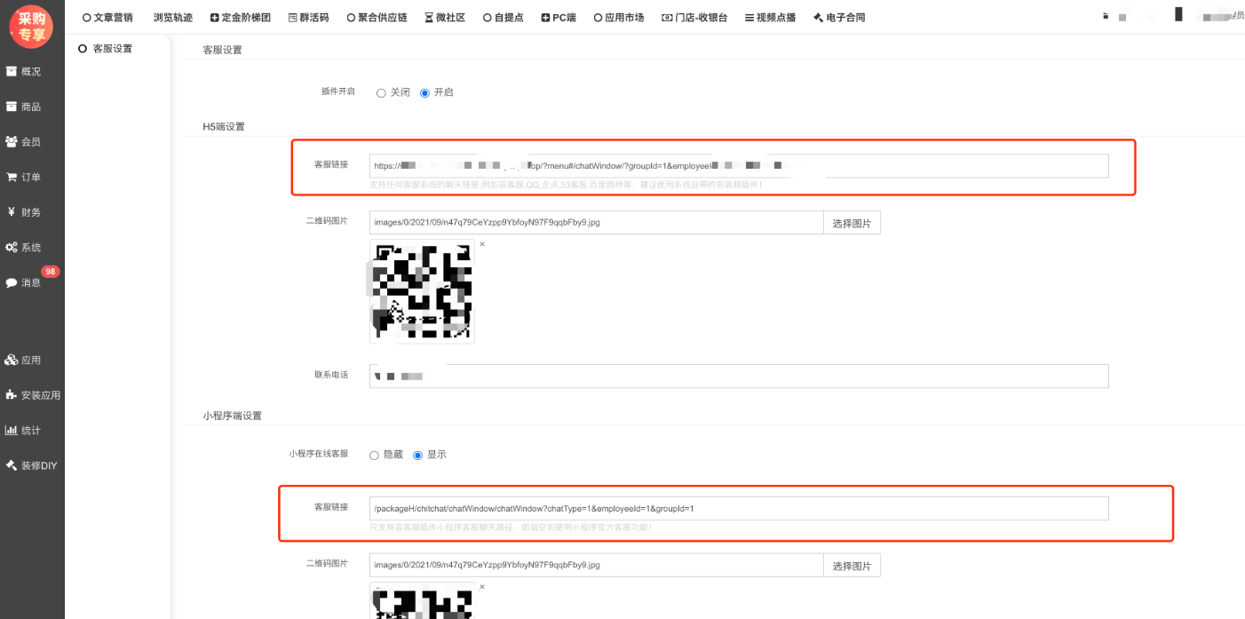 H5端设置客服链接设置填写H5链接;