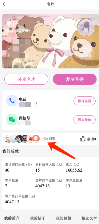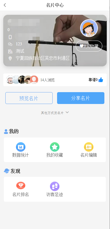 2,访问次数为用户访问你的名片的次数,刷新一下也会增加一次;收藏次数为用户收藏你的名片的次数;靠谱次数为点赞次数
