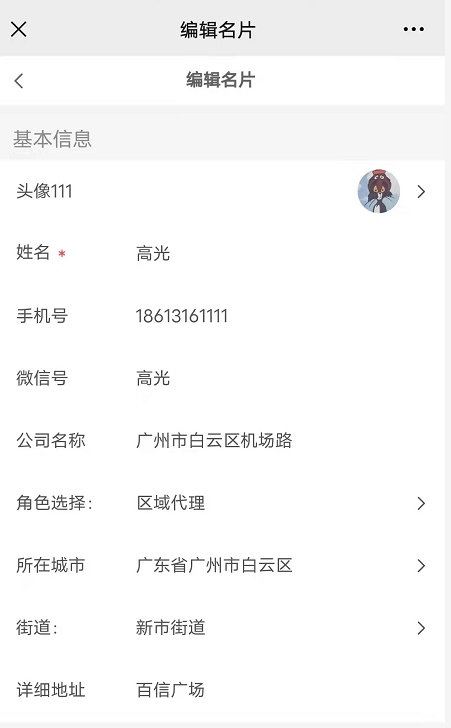 5,名片编辑:编辑自己的名片,可编辑名片头像、姓名、手机号、微信号,微信二维码,角色、所在城市、简介、图片,详定位位置;如果角色是会员/推客/区域代理/供应商/店长/店员,则还是可以选择添加商品,添加商品后别人访问你的名片可点击查看商品【选择商品最多只能选择8件】
