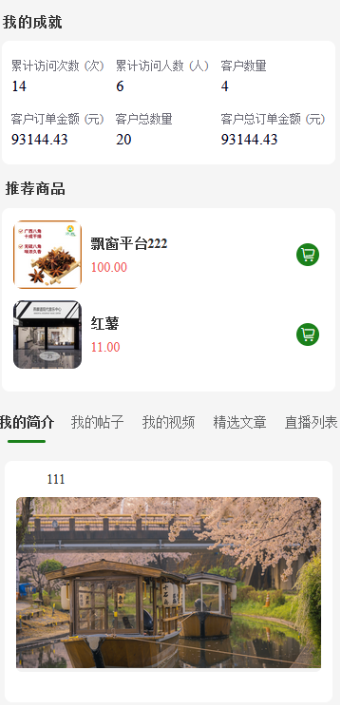 11,我的成就:显示的是名片会员的成就;显示的图片为名片会员上传的图片,如果名片会员选择的是招商员/招商中心角色,则会显示我推荐的所有商家;如果是其他角色则显示推荐的商品