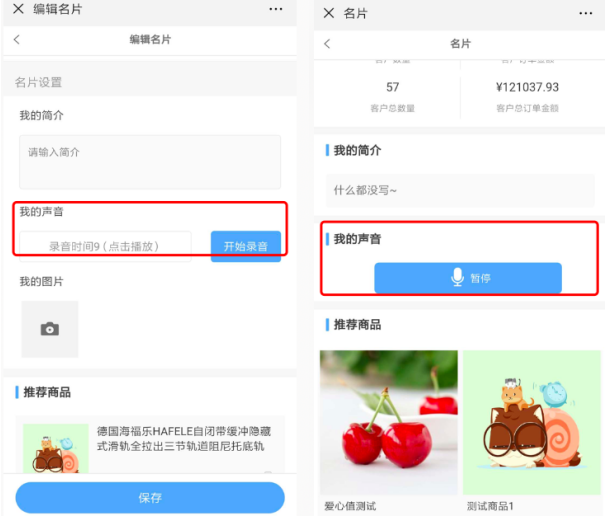 6,微信和小程序端编辑名片处还可以选择录音,录好音后点击保存其他会员访问即可以查看录音
