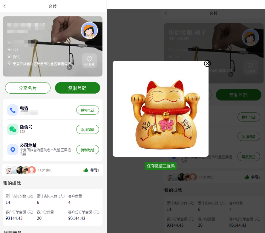 2,后台可查看到名片的二维码和链接,新会员通过这个二维码和链接访问名片,同样可以锁定为改名片的下线